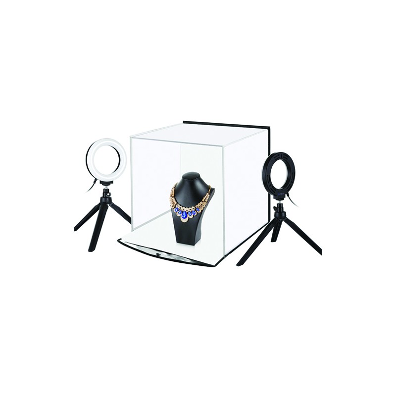 Fotografavimo dėžė, 30x30x30cm. su keičiamu fonu ir žiedinių lempų komplektu.