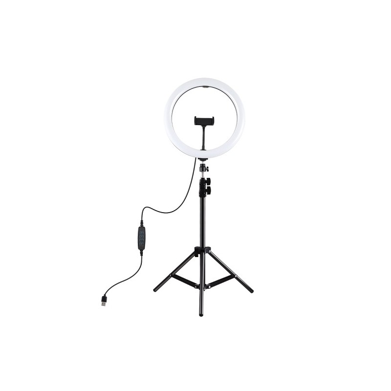 LED žiedinė lempa 30cm skersmens su trikoju stovu reguliuojamu iki 1.1m aukščio, su telefono laikikliu.